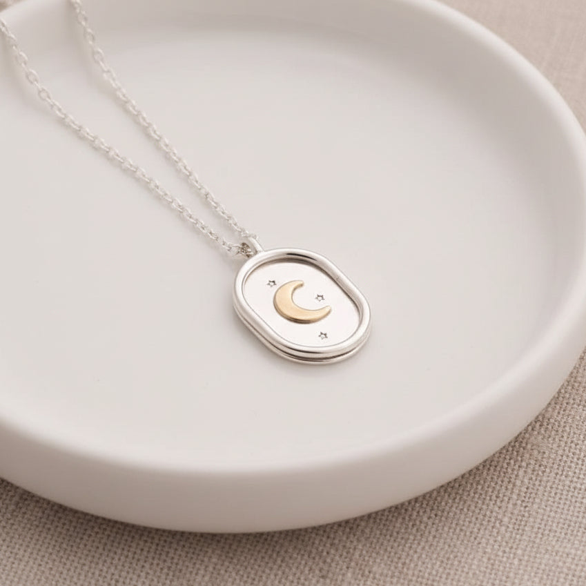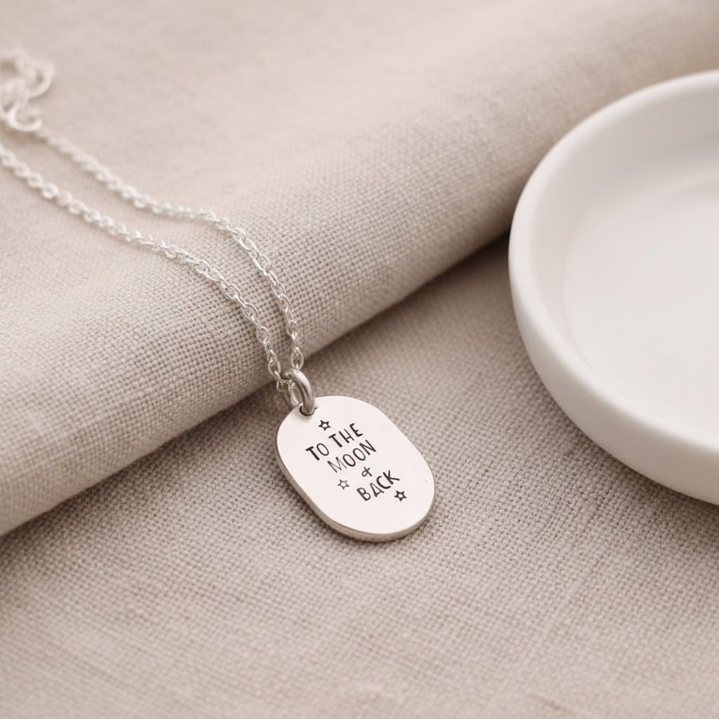 Celebrate your deepest affection with this enchanting sterling silver necklace, featuring a delicate brass moon. The back is thoughtfully stamped with "to the moon and back" - a timeless reminder of boundless love and devotion. Perfect for gifting to someone special or treating yourself to a meaningful piece that captures the essence of going the distance for those who matter most.
