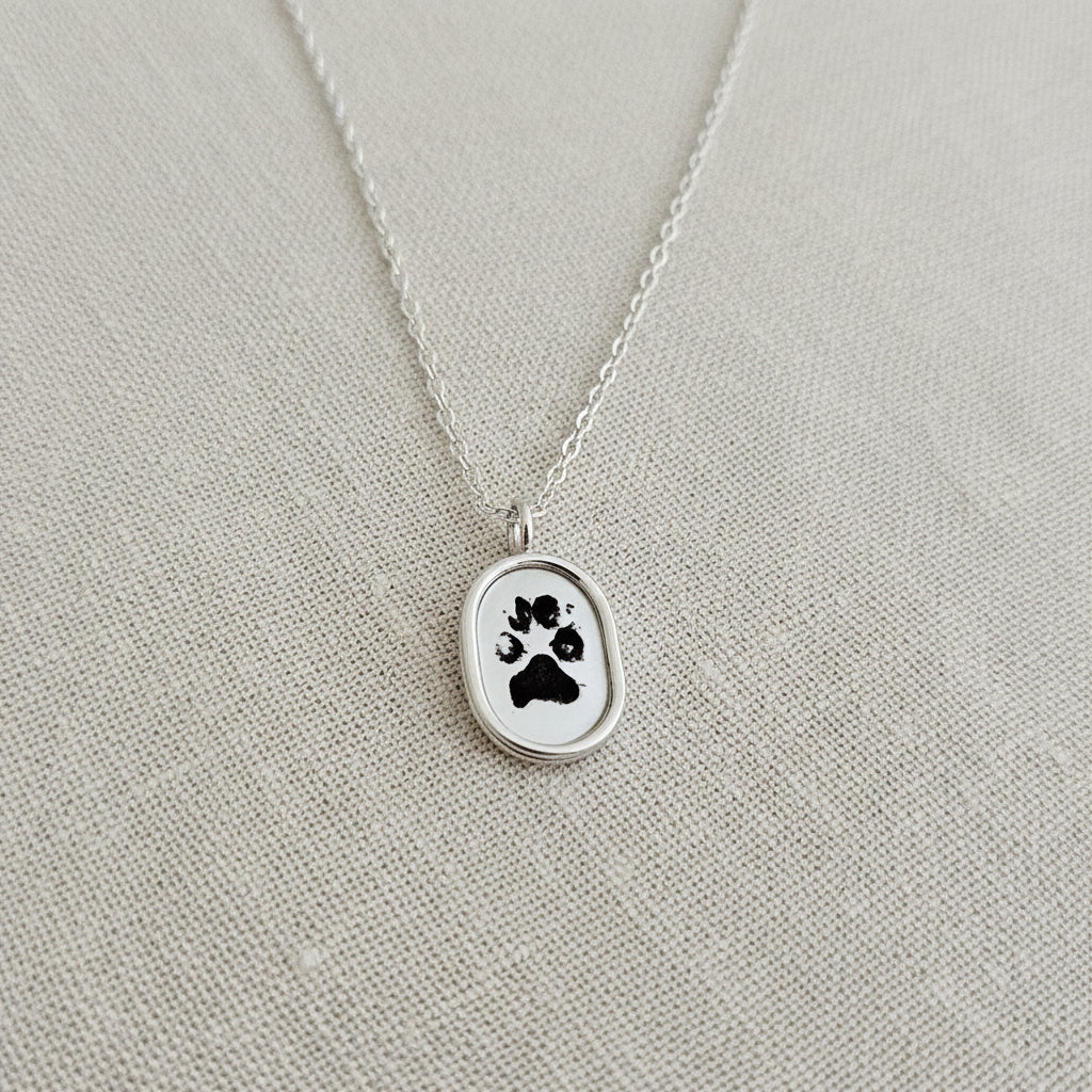 Capture your pet's unique identity in sterling silver. This custom necklace features an actual laser-engraved paw print from your furry companion - not a generic design. Simply provide a clear photo or scan of the impression, and I'll engrave every distinctive line and pad detail onto solid sterling silver, creating a permanent, darkened impression that's unmistakably yours. Each pendant is hand-framed with 18g sterling silver wire, forming a refined picture-frame edge that complements the personalized center. Choose between a round or oval shape to suit your style. Whether worn as a cherished memorial or an everyday reminder of your best friend's presence, this piece combines minimalist elegance with profound sentimental value - a timeless keepsake that celebrates the bond you share.